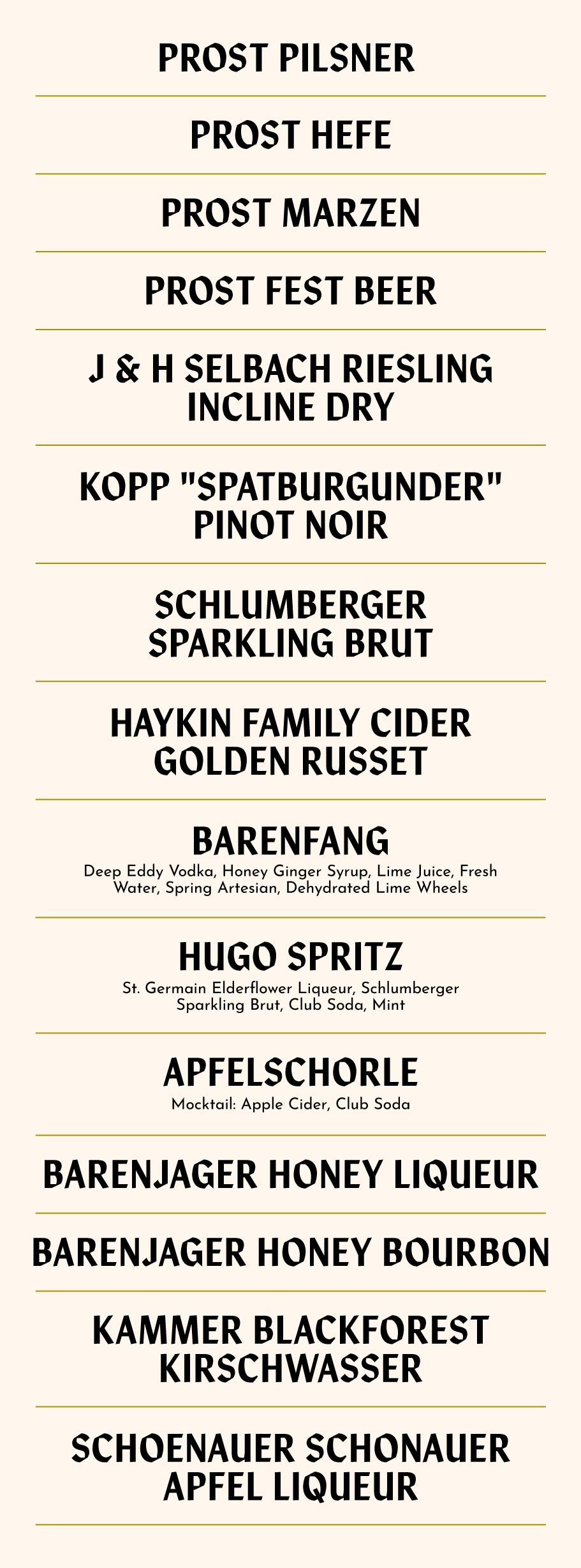 PROST BIER, GERMAN WINE, TRADITIONAL COCKTAILS, CIDER + MORE.